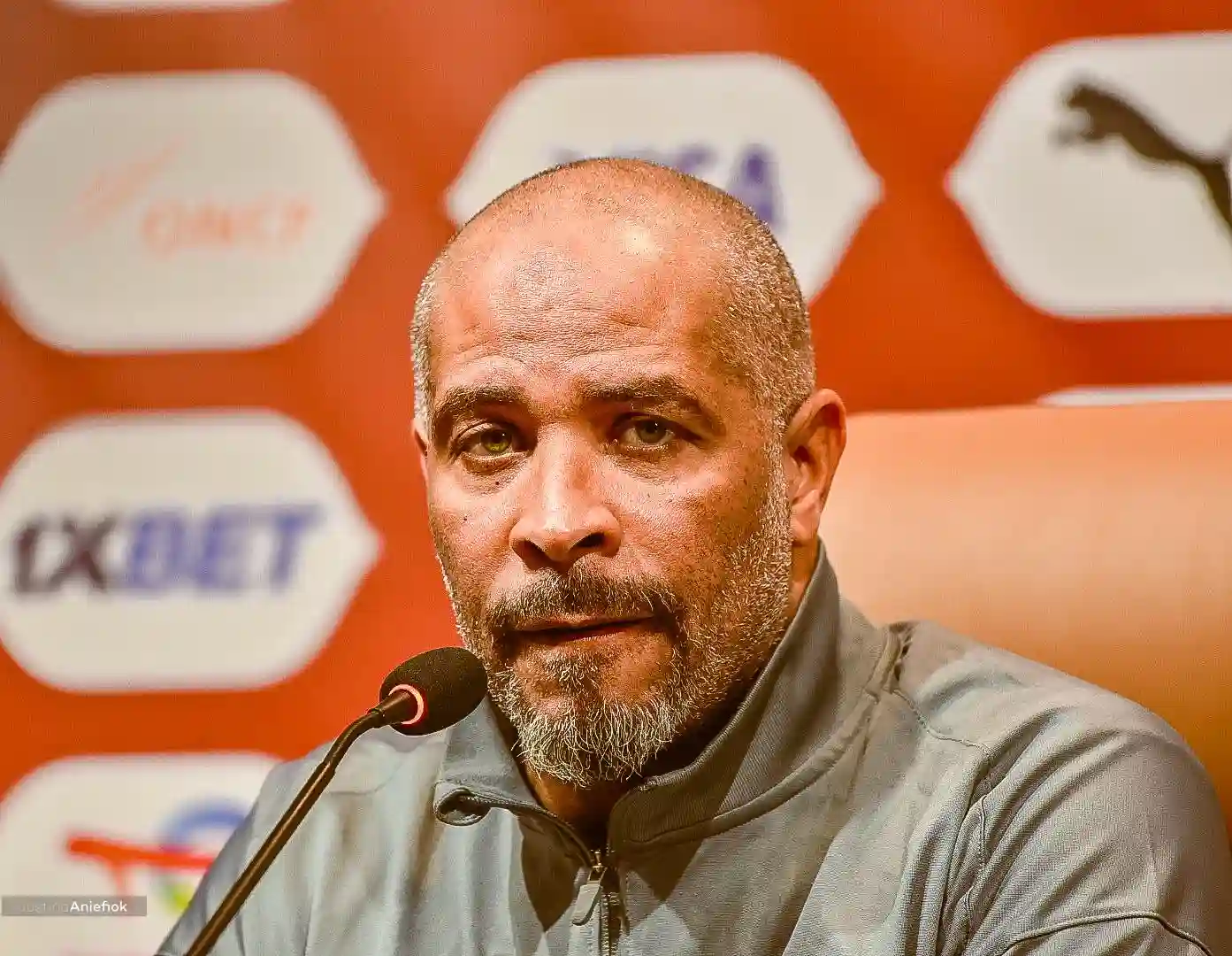 Eric Chelle in the pre match press conference. Photo Credit: Justina Aniefiok