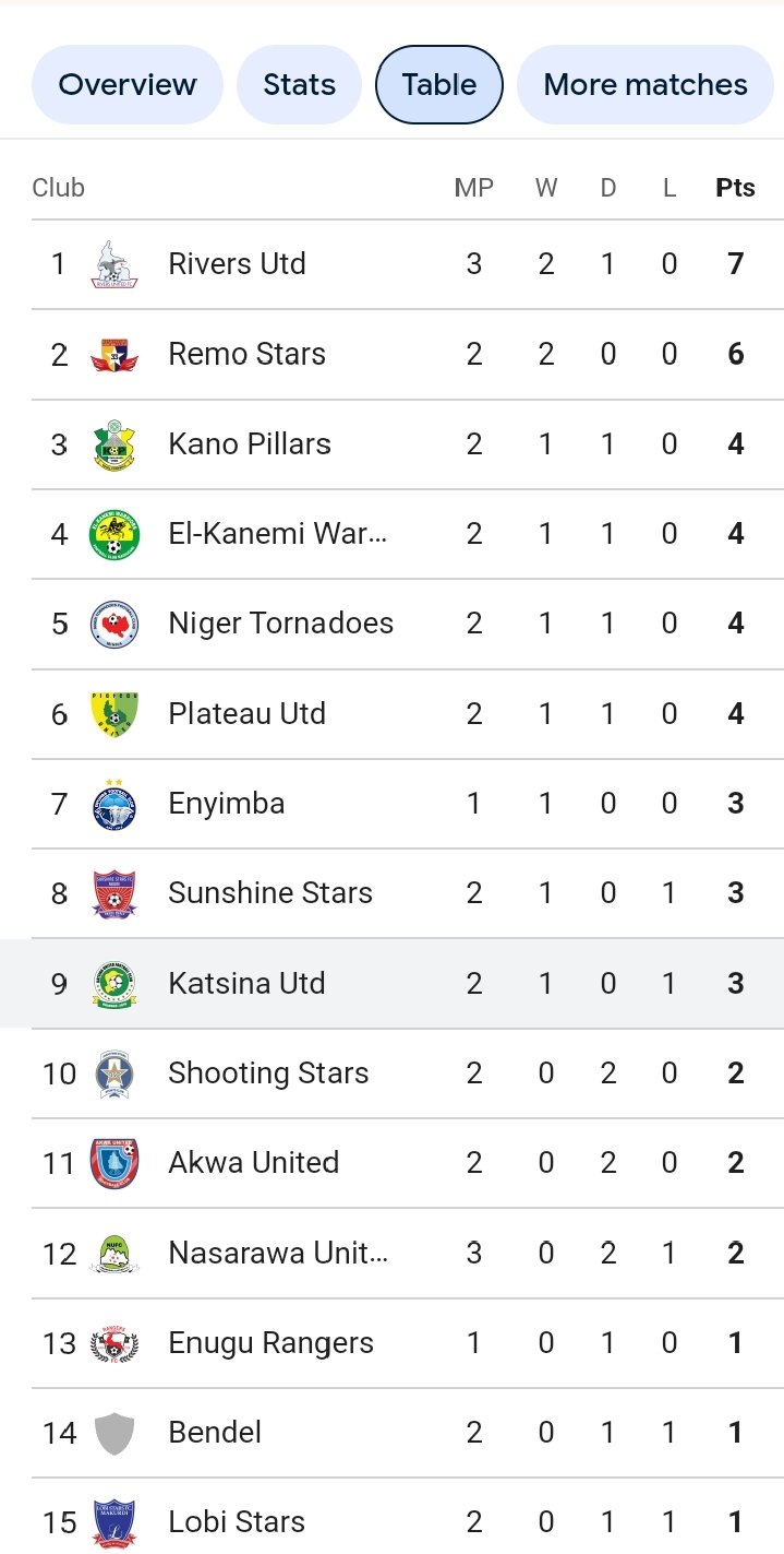 Rivers Utd (3-2-1-0, 7 points), Remo Stars (2-2-0-0, 6 points), Kano Pillars (2-1-1-0, 4 points), El-Kanemi Warriors (2-1-1-0, 4 points), Niger Tornadoes (2-1-1-0, 4 points), Plateau Utd (2-1-1-0, 4 points), Enyimba (1-1-0-0, 3 points), Sunshine Stars (2-1-0-1, 3 points), Katsina Utd (2-1-0-1, 3 points), and Shooting Stars (2-0-2-0, 2 points).
