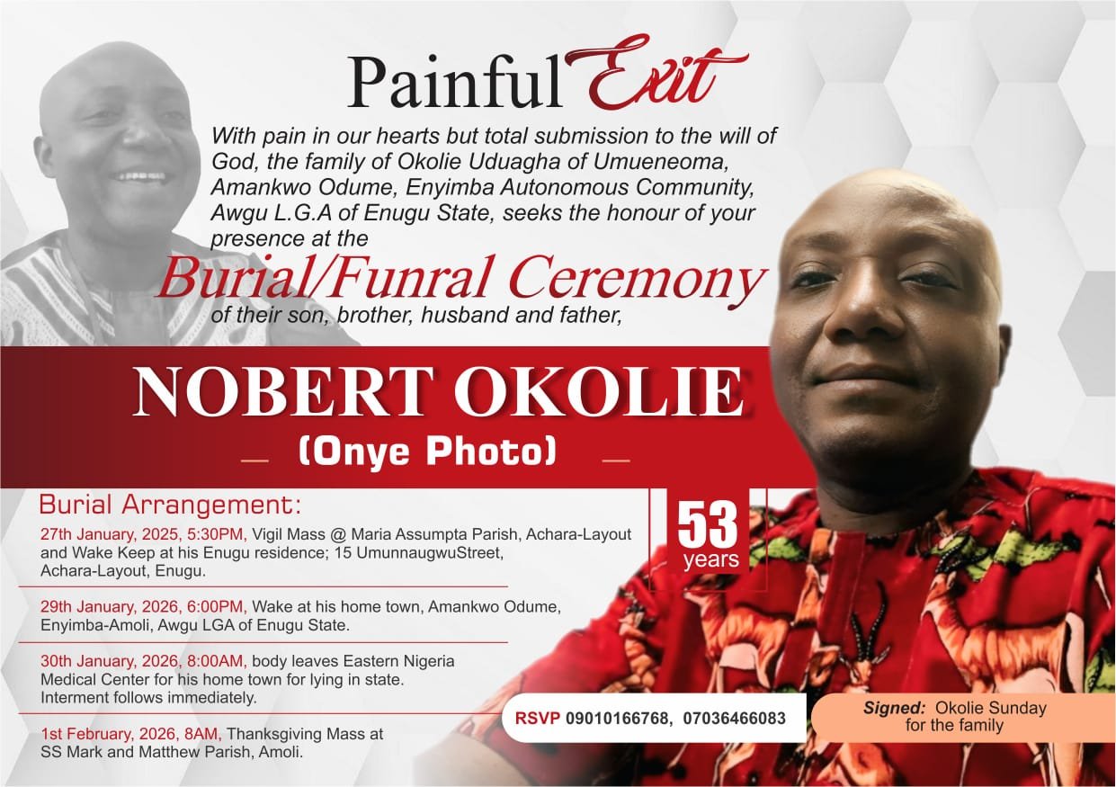 Another wake is scheduled for Wednesday, 29 January 2026, at his hometown of Amankwo Odume, Enyimba-Amoli, in Awgu Local Government Area of Enugu State.