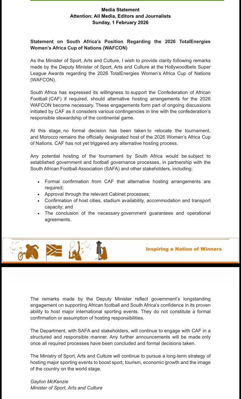 The statement concluded by reaffirming South Africa’s commitment to the development of women’s football on the continent and its willingness to support CAF, while stressing that any confirmed decision regarding the 2026 WAFCON would be communicated formally and transparently.