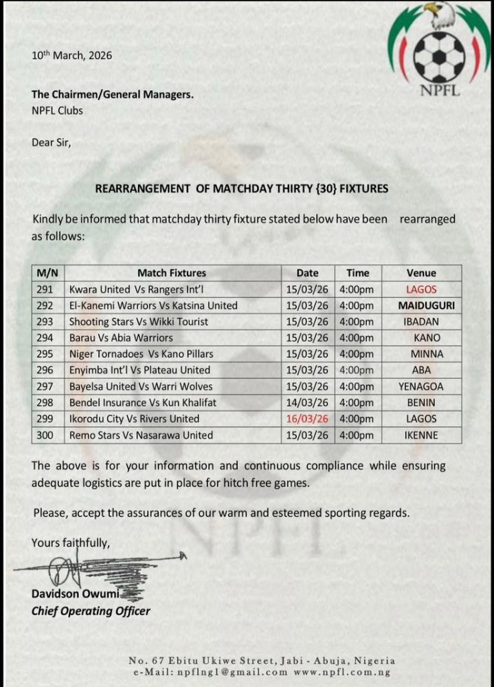According to a circular dated March 10 and signed by Chief Operating Officer Davidson Owumi, the fixtures will now take place between March 14 and March 16, with most matches kicking off simultaneously at 4:00 pm.