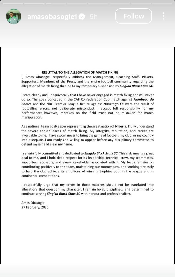 Super Eagles goalkeeper Amas Obasogie has rejected allegations of match-fixing following his recent suspension by Singida Black Stars SC, insisting he has never engaged in manipulation of matches.