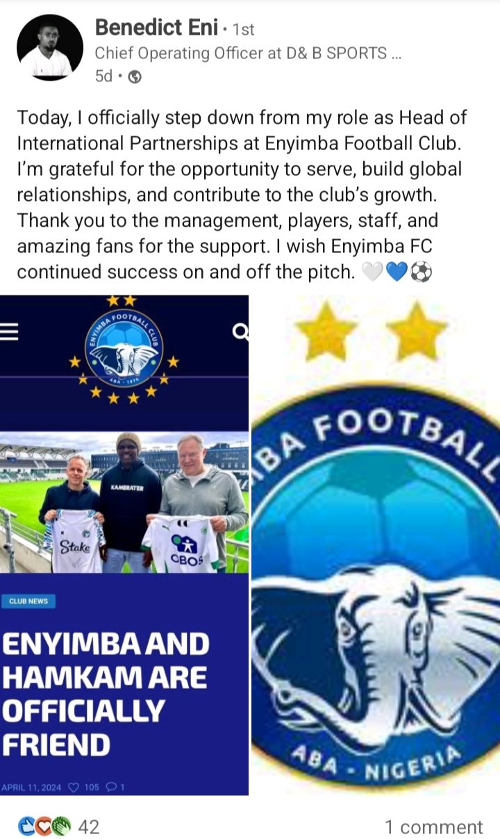In January 2026, Benedict Eni resigned as Head of International Partnerships at Enyimba in a post on LinkedIn.
